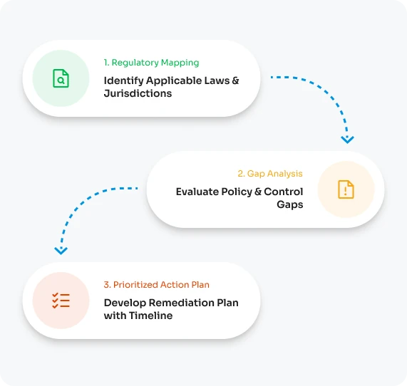 Identify and assess applicable regulations, comparing them against the company’s existing security and governance practices.